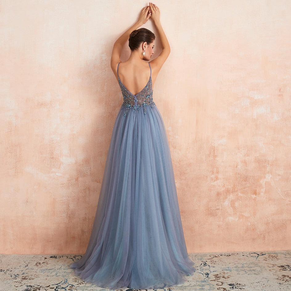This exquisite A-Line gown features a floor-skimming silhouette, adorned with a stunning Sweep Train, complemented with elegant Spaghetti Straps and a V-Neckline. Delicate Crystal, Pearl, and Sequin Detailing grace the bodice while a dainty Thigh Slit, crafted with soft Tulle fabric, adds an alluring touch to this piece, perfect for special occasions like prom and weddings.